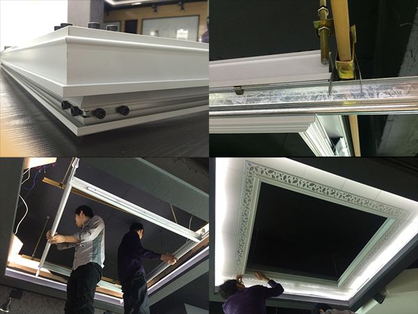 首先是地面工作,在平整的地面上完成MK手机网页版登录入口Smart复式角线框,并完成框上三角龙骨的安装。待所有地面工作完成后开始顶上作业,确定Smart复式角线内框的安装位置,在偏离框外2公分左右确定膨胀螺栓的四个基准点,确定吊顶高度,依次安装角线、丝杆、主龙,再把之前安装好的MK手机网页版登录入口Smart复式角线框上到顶上,依次装上外围铝板,安装内侧铝板,先装两边再装中间。