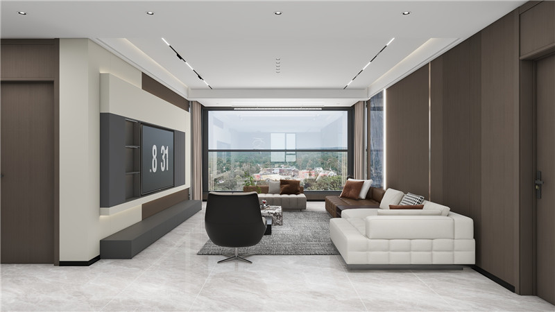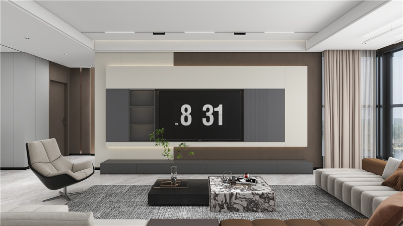 客厅的一侧,是一面深色的定制收纳柜,柜门采用无拉手设计,与墙面完美融合,内部合理的分区满足了收纳与展示的需求。