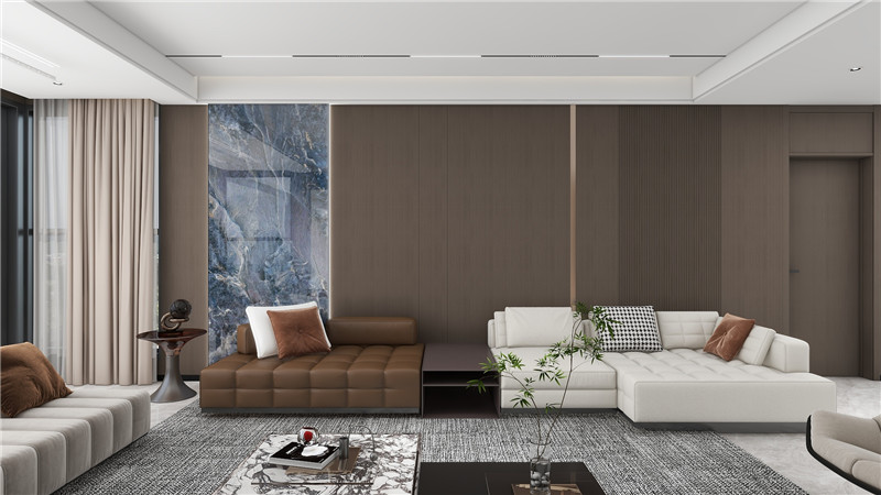挑空的大厅设计,更能展示大宅风范。踏入客厅,首先映入眼帘的是一片顶天立地的电视背景墙。岩纹+木纹+肤感的律动组合,使得整个墙面立刻生动起来,连纹画面的呈现承托了整个客厅的大宅气势,大气而磅礴。搭配着深灰色地毯和转角几何皮质沙发,没有过多的装饰,却凭借着精湛的工艺,展现了无与伦比的质感。