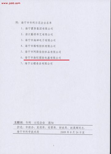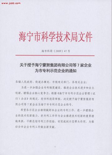 为进一步强企业专利制度建设,推进企业技术进步和自主创新,增强企业核心竞争力,根据《海宁市专利示范企业管理(试行)办法》的规定,经海宁市科技局审核,海宁市MK手机网页版登录入口塑胶电器有限公司被授予海宁市专利示范企业称号。