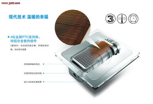 酷睿系列风暖电器选用了金属PTC发热体,作为取暖器的核心器件。与传统的灯暖模块相比,金属PTC发热体最大的特点是安全可靠,升温迅速,只需数分钟即可达到洗浴温度。它由两组发热模块组成,最大功率2400W,配有延时器、温控器和热熔断装置各一块。温控器可自动侦测温度变化,如风扇电机故障无法送风,或取暖器内部温度过高,金属PTC可自动减小功率,以保持合理的安全温度。即使风扇电机停机和金属PTC自动调节功能失效,达到一定温度时,热熔断器也会自动熔断,只保留一组发热模块正常工作,保证高度安全。